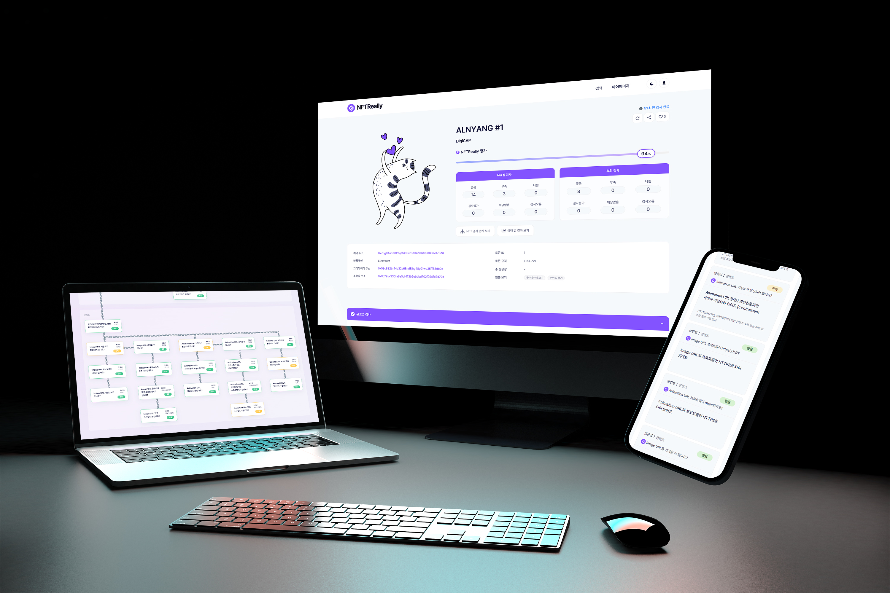 NFTReally의 대표적인 검사 항목인 유효성 검사에서는 NFT의 메타데이터와 디지털 자산 정보가 변경될 가능성에 대해 검사하고, URL의 정보를 올바르게 불러올 수 있는지 다방면으로 유효성을 체크한다. 뿐만 아니라 NFT의 소스 코드 공개 여부를 체크해서 NFT 데이터의 투명성을 확인할 수 있고, ERC-721과 같은 표준 양식을 준수하여 추후에 호환성 문제에 대한 가능성도 가늠할 수 있다.